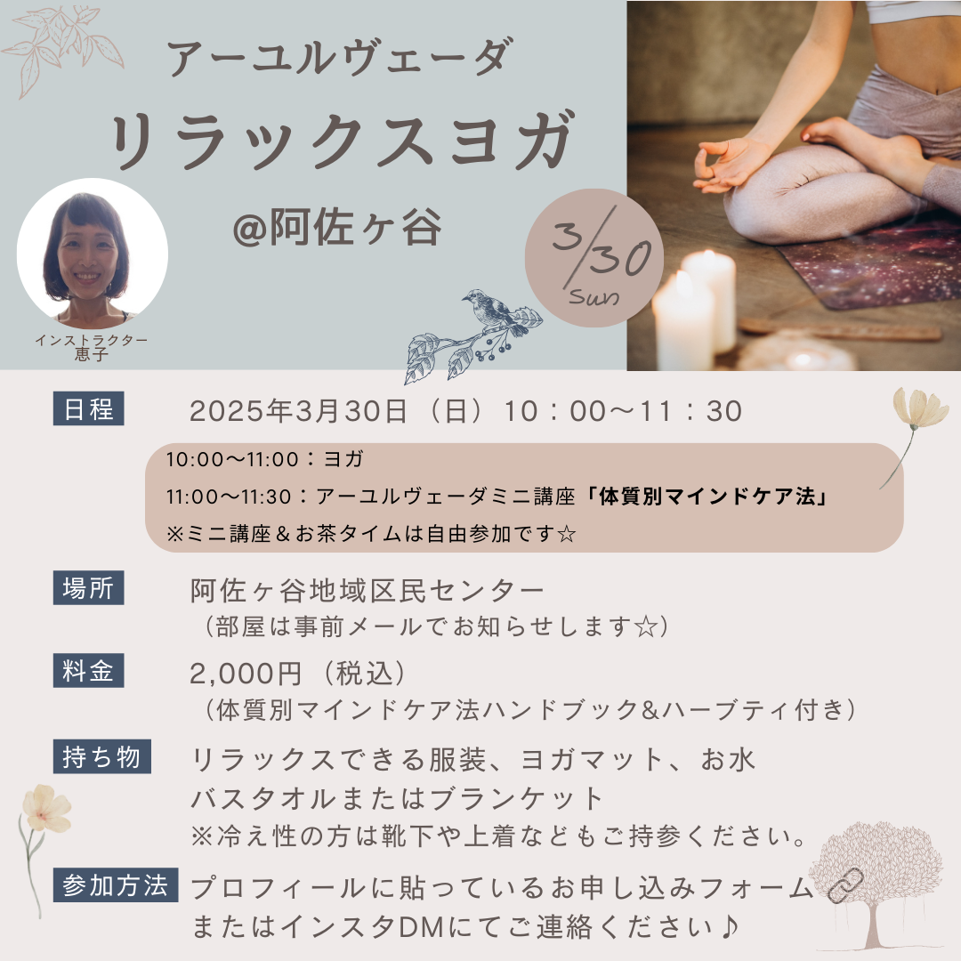 2025年3月30日(日)10:00〜「アーユルヴェーダリラックスヨガ@阿佐ヶ谷」を開催します🤗
