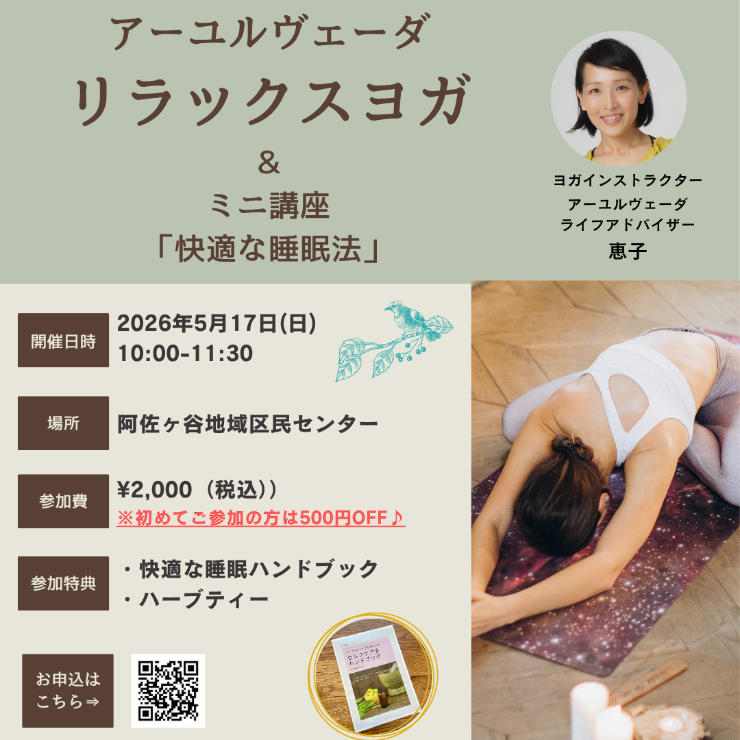 2026年5月17日(日)10:00〜「アーユルヴェーダリラックスヨガ@阿佐ヶ谷」を開催します🤗