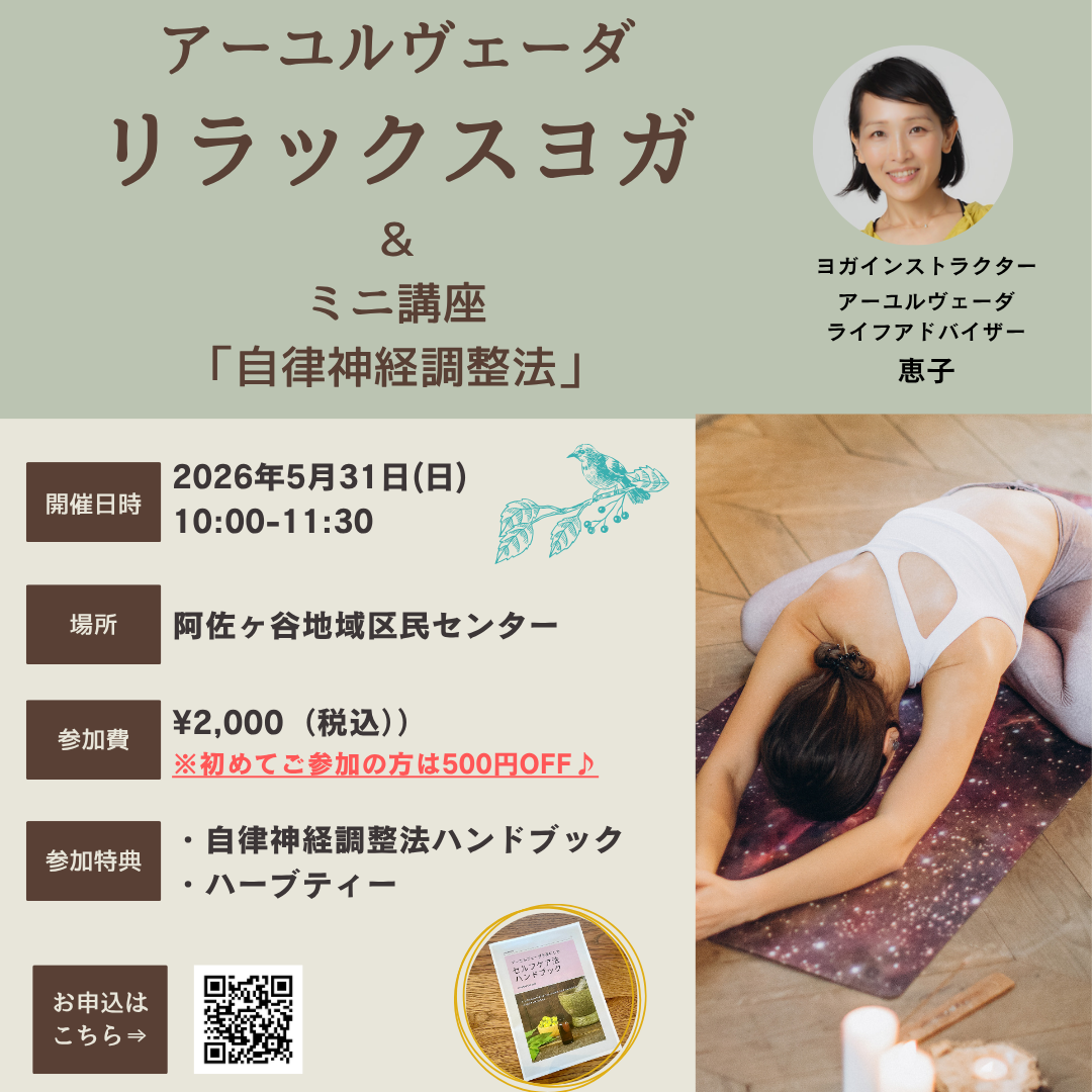 2026年5月31日(日)10:00〜「アーユルヴェーダリラックスヨガ@阿佐ヶ谷」を開催します🤗