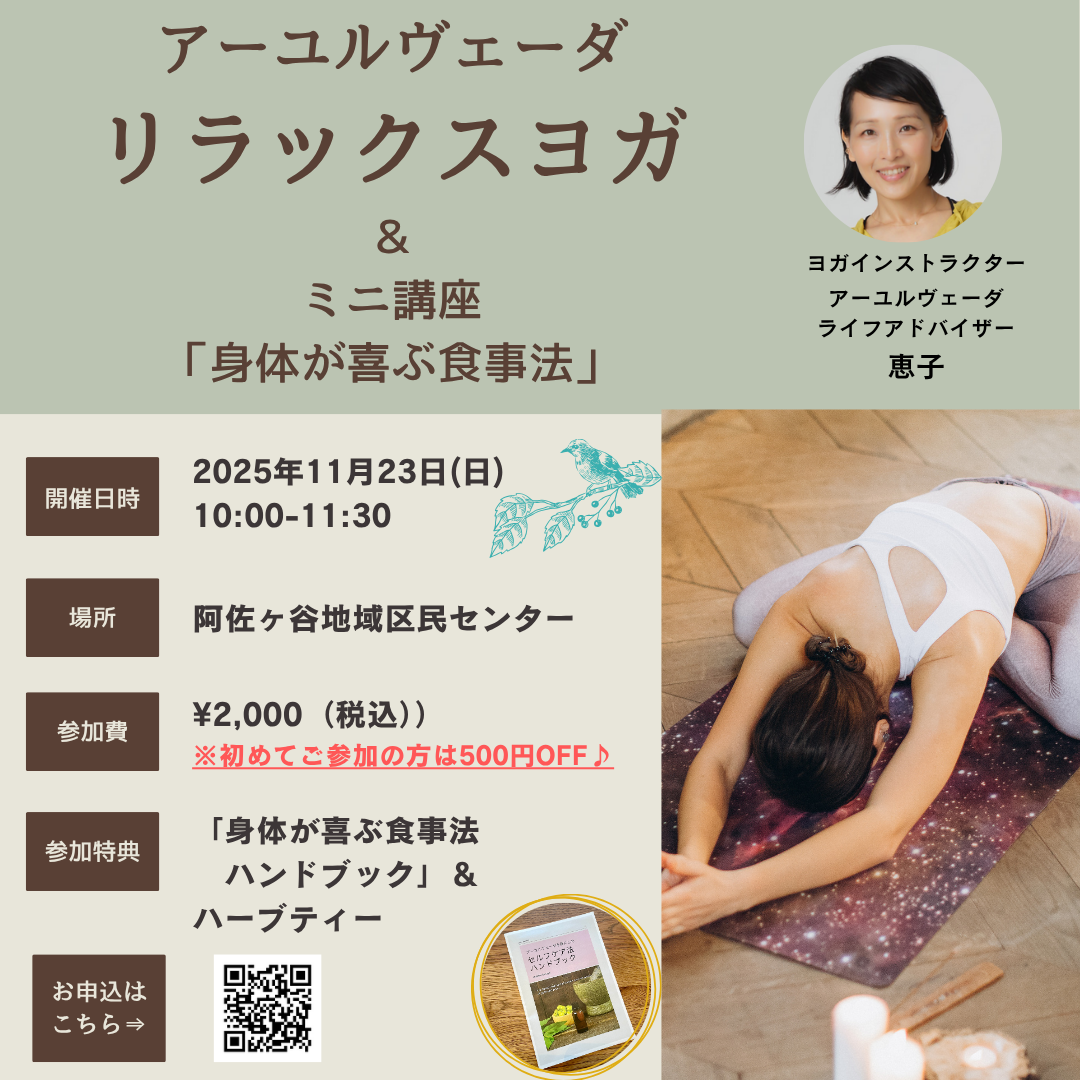 2025年11月23日(日)10:00〜「アーユルヴェーダリラックスヨガ@阿佐ヶ谷」を開催します🤗